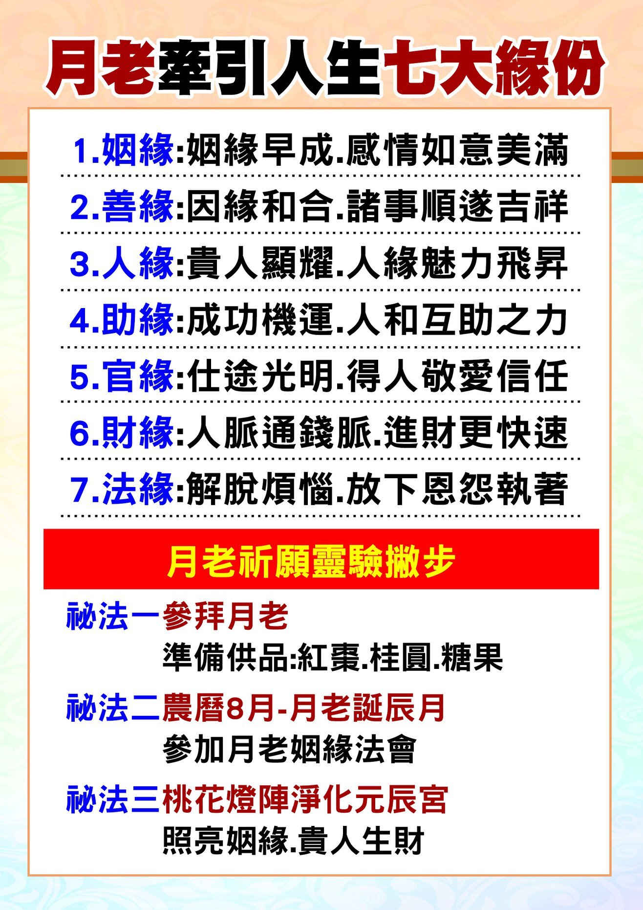 其實,月老不僅守護戀愛緣分,也掌管人際、貴人和財富。只要抓住「人緣財」這個關鍵,你的桃花、人脈、財運都能一起打開!